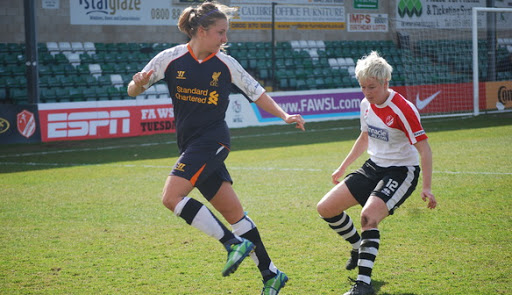 For the first ten minutes the two teams struggled to find their rhythm, both trying to get a hold on the game. Everton had a couple of early chances, first a Toni Duggan strike was blocked by Liverpool captain Gemma Bonner then Laws saved well from Nikita Parris. Once Liverpool settled it was the same as the Lincoln game, Liverpool holding the majority of the possession barely allowing Everton a sniff of the ball. The reds crept closer and closer to the Everton goal, both Nicole Rolser and Amanda Da Costa cutting through the Everton defence but being offside. Bronze then hit a great ball to Da Costa but her cross was sent narrowly wide by Corina Shroder. Liverpool now with all the pressure and growing in confidence, Engen up from a corner won the ball back and put it back into the box but Fara Williams placed her shot the wrong side of the post. Rolser then had a number of chances, her first sailed over the crossbar and in hindsight could have been passed to the waiting Natasha Dowie. Amy Kane blocked Rolser’s second goal bound effort however the Everton defence then failed to deal with the ball in the box and she slotted home her second goal of the season. Dowie and Schroder were working well together on the left, shortly before half time Dowie crossed the ball to the unmarked Da Costa but the ball ran just behind her.  Despite the relentless assault Liverpool somehow went in at half time up by just one goal.