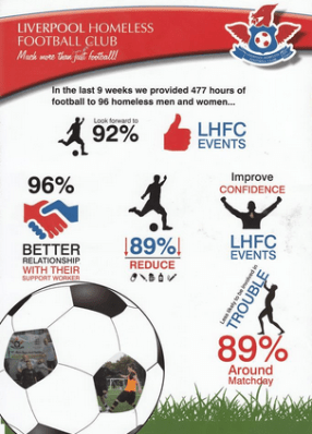 For a recent University module we had to put together a portfolio of articles, one of the articles I wrote was on Liverpool Homeless Football Club. I wanted to share the article because I think the work being done at the club is incredible, thanks to Lisa Thomas for providing me with an interview for the article and the stats! There are some links at the bottom to follow for more information on LHFC.