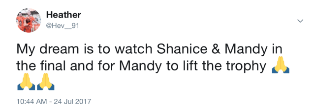 I tweeted as much – in my defence prior to the Netherlands knocking England out – “My dream is to watch Shanice & Mandy in the final and for Mandy to lift the trophy”.